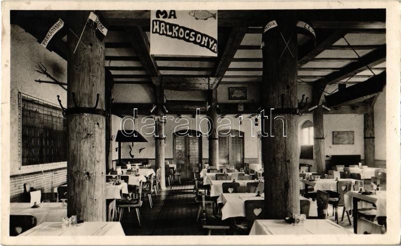 Budapest XIX. Kispest, Papp József a ponty szálkamentesítés feltalálójának Halásztanya éttermei, belső, Párkánynána, Losonc, Érsekújvár, Léva, Munkács, Komárom, Jolsva és Rozsnyó zászlók, "Ma halkocsonya". Petőfi tér 6.