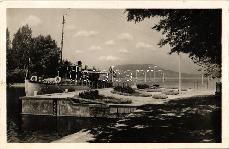 Beschreibung: Fonyód, Hajóállomás, háttérben a Badacsony, "Tünde" motoros személyhajó