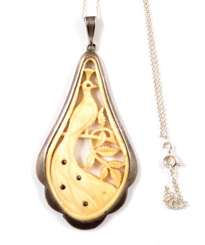 Beschreibung: Ezüst(Ag) lánc csonttal díszített medállal, jelzett, h: 37 cm, 6×3 cm, bruttó: 6,5 g