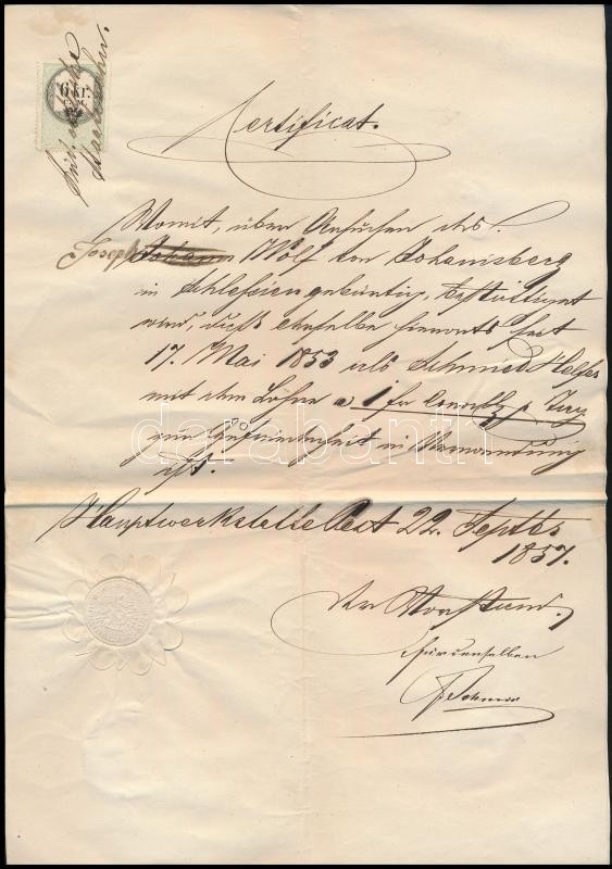 Beschreibung: 1857 Pest, a Südösterreichische Staatsbahn pesti főműhelyének német nyelvű igazolása sziléziai származású személy részére