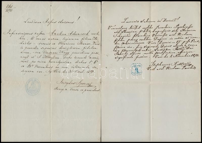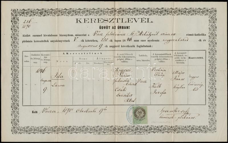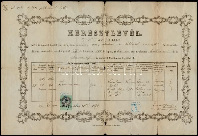 1866-1885 Vác, Vegyes okmány tétel (keresztlevél, anyakönyvi kivonat),... https://www.darabanth.com/de/347-Fernauktion/347.0/Kunst-Dokumente-andere-Sammelgebiete/Dokument~500017/1866-1885-Vac-Vegyes-okmany-tetel-keresztlevel-anyakonyvi-kivonat-okmanybelyegekkel-6-d~II1972179