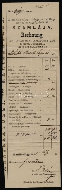 1885 Marillavölgy, Az erdélyi marillavölgyi gyógyintézet számlája Baróti Lajos (1856-1933) irodalomtörténész számára kiállítva, hátoldalon egy részletes recepttel, hajtogatva, de jó állapotban