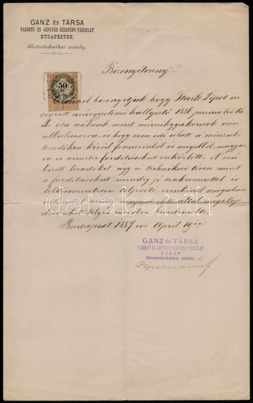 1887 Stark Lipót (1866-1932) mérnök, gépészmérnök, erőműtervező, vezetékszámítás hazai úttörője, a Magyar Villamosművek Országos Szövetségének alapítója és elnöke, az Elektromos Művek első vezérigazgatójának mérnökgyakornoki bizonyítványa a Ganz és Társa Vasöntő és Gépgyár Rt.-tól, 50 kr. és 15 kr. okmánybélyegekkel, pecséttel.
