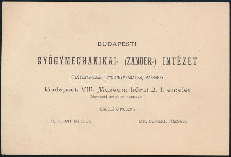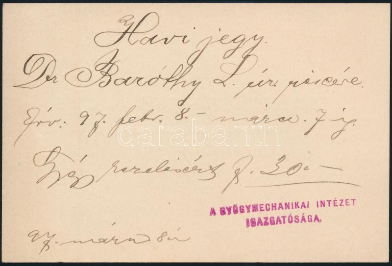 Beschreibung: 1897 A budapesti Gyógymechanikai (Zander) Intézet havijegye, dr. Baróthy Lajos (1856-1933) irodalomtörténész részére kiállítva