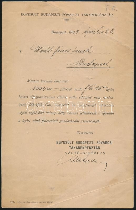 1903 Bp., Egyesült Budapesti Fővárosi Takarékpénztár által kiállított ... https://www.darabanth.com/de/347-Fernauktion/347.0/Kunst-Dokumente-andere-Sammelgebiete/Dokument~500017/1903-Bp-Egyesult-Budapesti-Fovarosi-Takarekpenztar-altal-kiallitott-lejart-valto-kifiz~II1972036