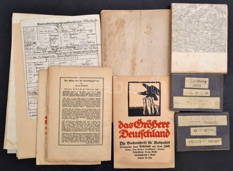 1910-1930 Vegyes militária tétel, 11 db Dr. Gustav Stresemann: Englangds Wirtschaftskrieg gegen Deutschland. Der Deutsche Krieg. Stuttgart-Berlin, 1915, Deutsche Verlags. Kiadói papírkötés. Alfred Hettner: Die Ziele unserer Weltpolitik. Der Deutsche Krieg. Stuttgart-Berlin, 1915, Deutsche Verlags. Kiadói papírkötés. 3 db térkép: Dél-Tirol, Janja, Jamina-Bjelina térképei, vászonra kasírozva, 39x55 cm és 69x55 cca 1916 Európa hadi térképe, 1:500.000, Stoits György, szakadozott, hiánnyal, 76x110 cm. Valamint 5 db különféle magyar és német nyelvű katonai okmány.