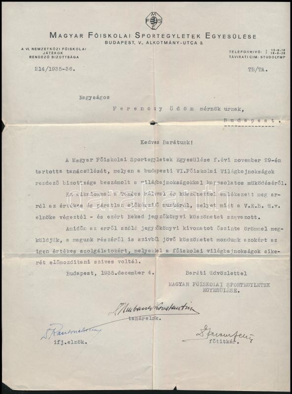 1935 Bp., Magyar Főiskolai Sportegyletek Egyesülése fejléces levélpapí... https://www.darabanth.com/de/347-Fernauktion/347.0/Kunst-Dokumente-andere-Sammelgebiete/Dokument~500017/1935-Bp-Magyar-Foiskolai-Sportegyletek-Egyesulese-fejleces-levelpapirjara-irt-level-rajt~II1972045