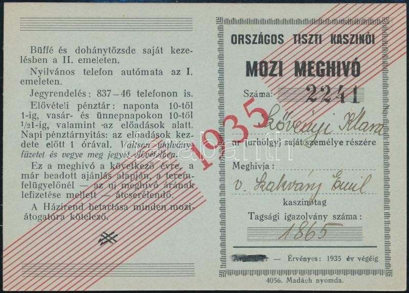 1935 Országos tiszti kaszinói mozimeghívó https://www.darabanth.com/de/347-Fernauktion/347.0/Kunst-Dokumente-andere-Sammelgebiete/Dokument~500017/1935-Orszagos-tiszti-kaszinoi-mozimeghivo~II1971190