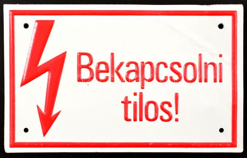 "Bekapcsolni tilos!" zománctábla, sérüléssel, 10×16 cm https://www.darabanth.com/de/347-Fernauktion/347.0/Kunst-Dokumente-andere-Sammelgebiete/Flohmarkt~500011/Bekapcsolni-tilos-zomanctabla-serulessel-10C39716-cm~II1969916