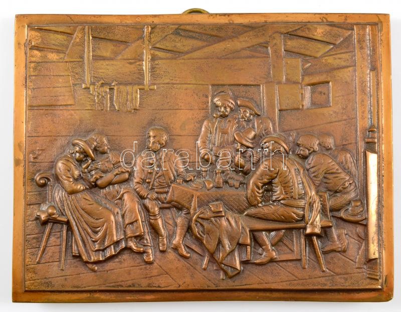 Beschreibung: Borozó társaság, réz falikép, 15,5×20 cm