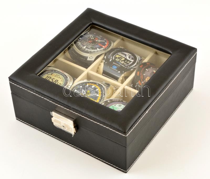 Beschreibung: Műbőr karóratartó doboz, 6 férőhellyel, jó állapotban, 18×18×8 cm