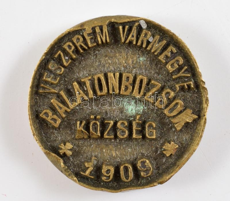 Veszprém Vármegye Balatonbozsok Község 1909 sérült pecsétnyomó fej, d:... https://www.darabanth.com/de/347-Fernauktion/347.0/Kunst-Dokumente-andere-Sammelgebiete/Flohmarkt~500011/Veszprem-Varmegye-Balatonbozsok-Kozseg-1909-serult-pecsetnyomo-fej-d-3-5-cm~II1970161
