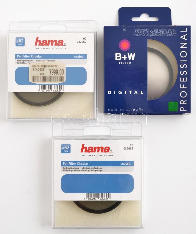 2 db Hama polár szűrő (62 mm), saját dobozában + B+W 25%-os szürke szűrő; saját dobozaikban
