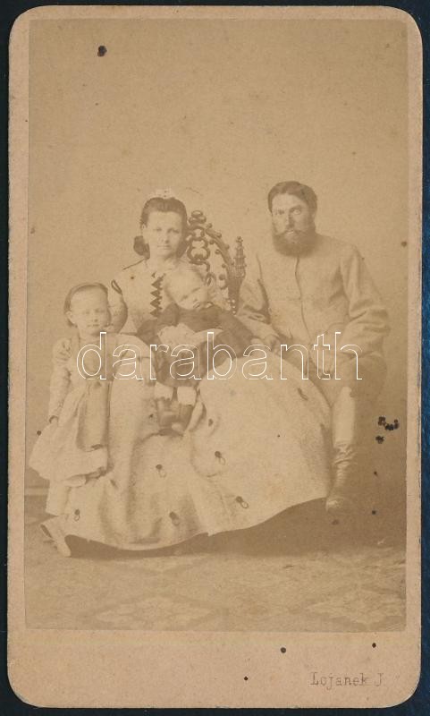 Beschreibung: 1860-1870 Nagyváradi család portréja, Nagyvárad, Lojanek János műterméből, keményhátú fotó, a hátoldalán névbejegyzéssel, a felületén folttal, 10x6 cm