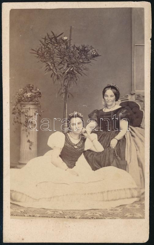 Beschreibung: cca 1864 Anya és eladósorban levő leánya, Mihály József egri fényképész műtermében készült, vizitkártya méretű fénykép, 10x6,3 cm