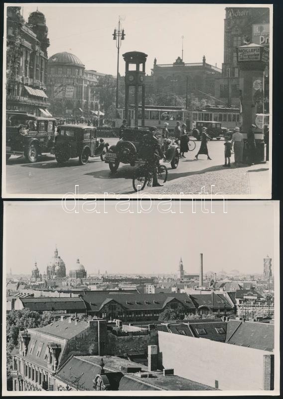 cca 1933-1934 2 db fotó Berlinről, egyik berlini panoráma fotó, rajta a Rotes Rathaus-zal, a Berlini Dómmal, Berlini Városi Palotával, a másik téren a Potsdamer Platz-zal, rajta a Kempinski Haus Vaterland épületével, Martin Djemil (?-?) feltaláló, hangutánzó parodista, rádióamatőr hagyatékából, 12x17 cmx2