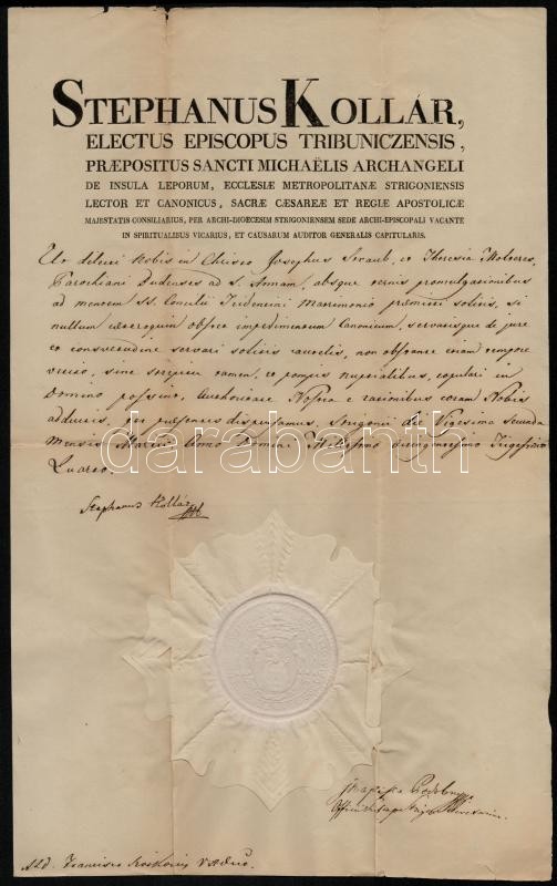1834 Kollár István (1764-1844) püspök, királyi tanácsos aláírt latin n... https://www.darabanth.com/de/347-Fernauktion/347.0/Kunst-Dokumente-andere-Sammelgebiete/Historische-Dokumenten-Handschriften~500018/1834-Kollar-Istvan-1764-1844-puspok-kiralyi-tanacsos-alairt-latin-nyelvu-levele-fejlec~II1969368