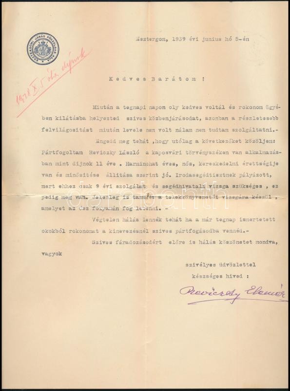 1939 Reviczky Elemér (1882-1965) esztergomi főszolgabíró protekciókérő levele, saját kezű aláírásával, borítékkal