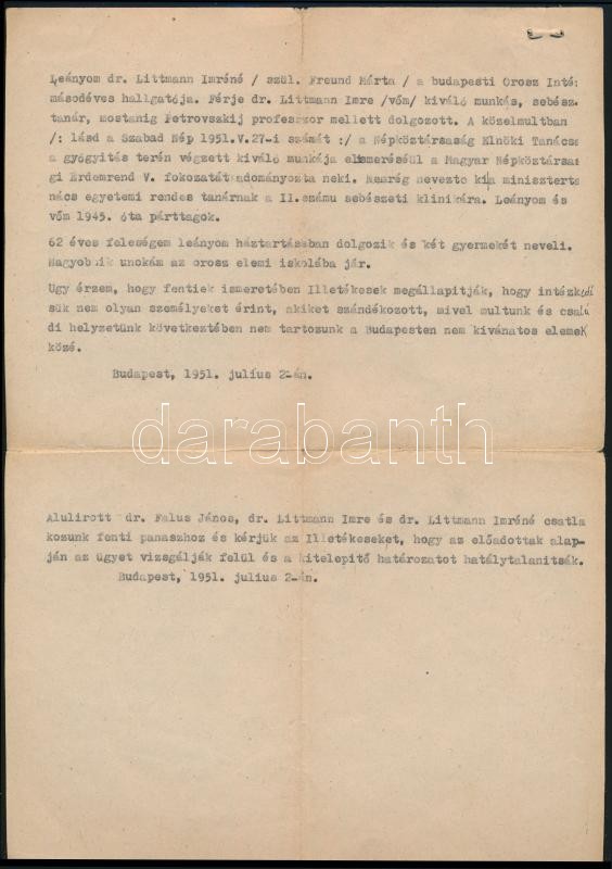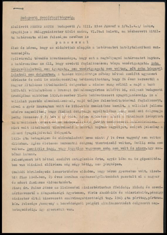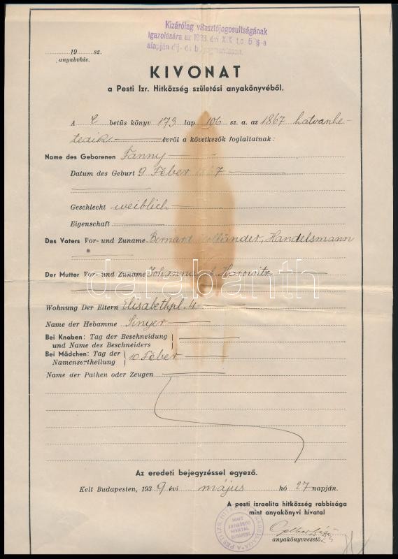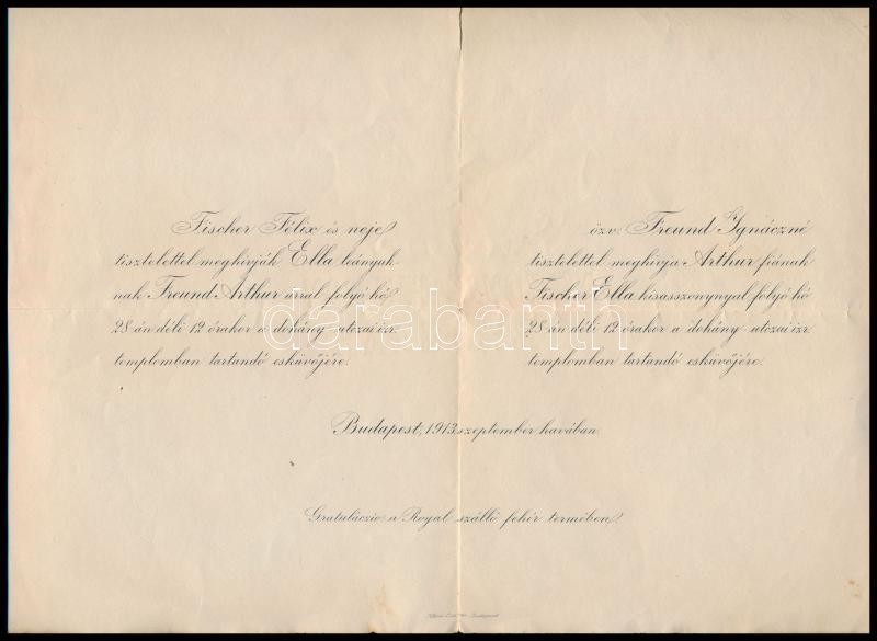 1913-1951 Vegyes judaikai papírrégiség tétel: Freund Arthur és Fischer Ella dohány utcai Zsinagógába szóló esküvői meghívója, valamint egy 1951-es panaszlevele, valamint a Pesti Izr. Hitközség által 1939-ben kiállított születési anyakönyvi kivonata, az anyakönyvi kivonat foltos. .