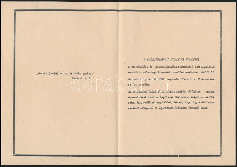 1948 Meghívó a zalaszentgróti holokauszt-emlékmű felavatására, 4 p. https://www.darabanth.com/de/347-Fernauktion/347.0/Kunst-Dokumente-andere-Sammelgebiete/Judaica~500024/1948-Meghivo-a-zalaszentgroti-holokauszt-emlekmu-felavatasara-4-p~II1972030