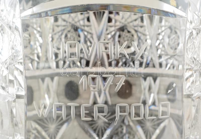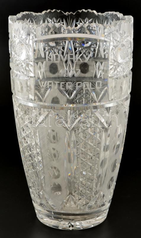 Beschreibung: Gyarmati Dezső (1927-2013) olimpiai bajnok vízilabdázó részére adott nagyméretű cseh kristályváza. hibátlan. Nováky 1977 water polo felirattal. 34 cm