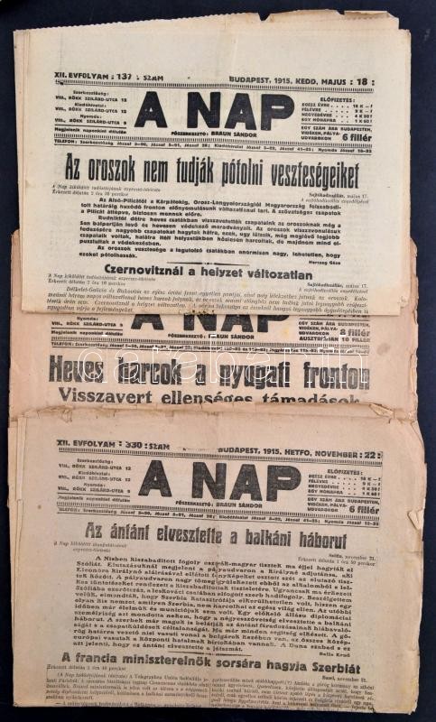 1915-1917 A nap három lapszáma érdekes háborús hírekkel https://www.darabanth.com/de/347-Fernauktion/347.0/Kunst-Dokumente-andere-Sammelgebiete/Militaria~500028/1915-1917-A-nap-harom-lapszama-erdekes-haborus-hirekkel~II1970209