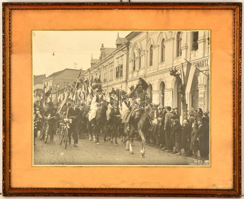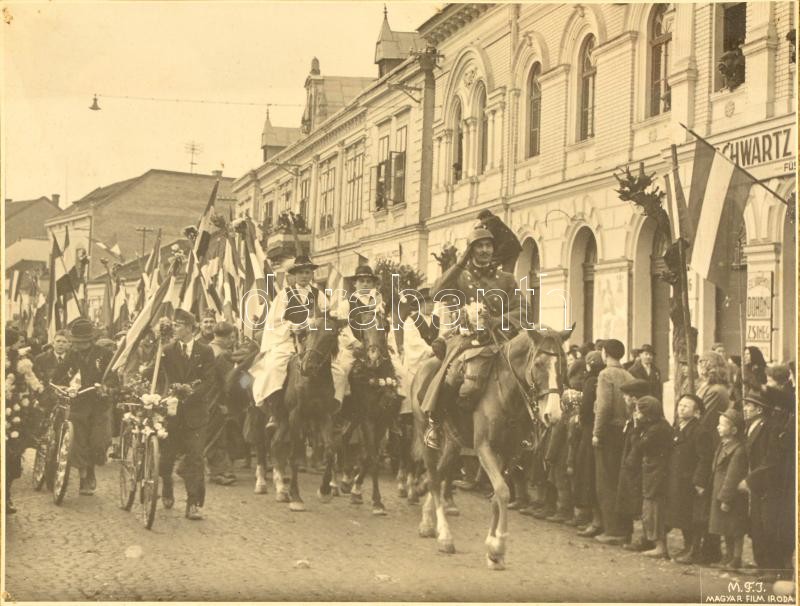1939 A beregszászi bevonulás díszünnepéllyel, elől Szalkai Ferenc ludovikás százados, MFI fotó korabeli üvegezett keretben, hátoldalon feliratozva, 22×27 cm