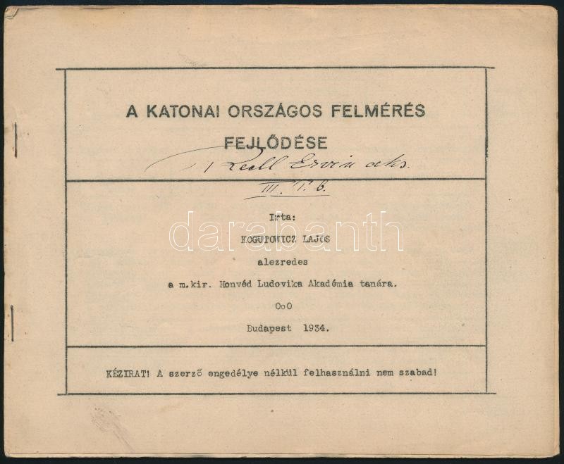 Kogutowicz Lajos: A katonai országos felmérés fejlődése. Bp., 1934. Ké... https://www.darabanth.com/de/347-Fernauktion/347.0/Kunst-Dokumente-andere-Sammelgebiete/Militaria~500028/Kogutowicz-Lajos-A-katonai-orszagos-felmeres-fejlodese-Bp-1934-Kezirat-gyanant-Tuzott~II1968896