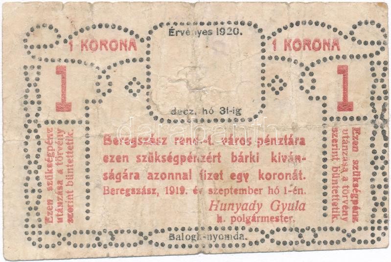 Beschreibung: Beregszász 1919. szeptember 1. 1K szükségpénz T:III- Adamo BER-1.1