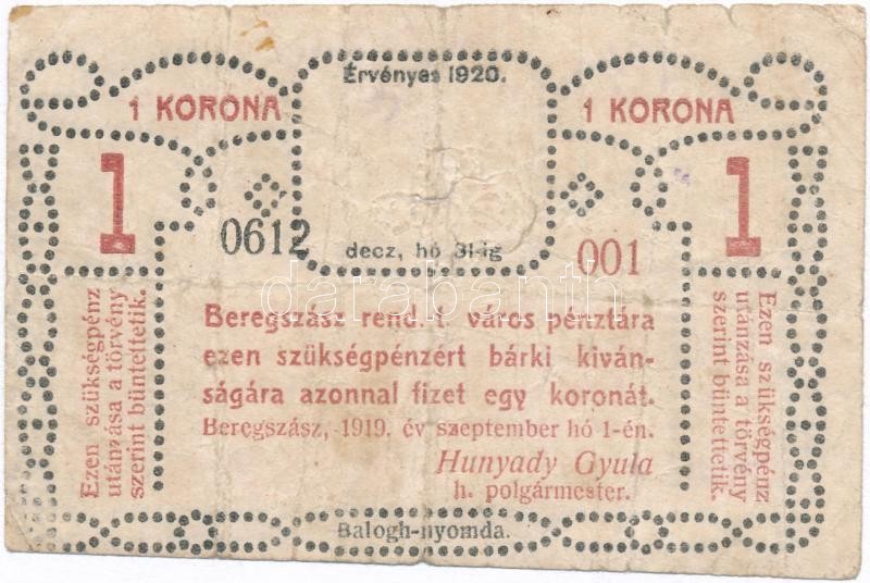 Beregszász 1919. szeptember 1. 1K szükségpénz T:III- Adamo BER-1.1 https://www.darabanth.com/de/347-Fernauktion/347.0/Numismatik/Notgeld-aus-Papier-und-Metall~1000005/Beregszasz-1919-szeptember-1-1K-szuksegpenz-TIII-Adamo-BER-11~II1969697