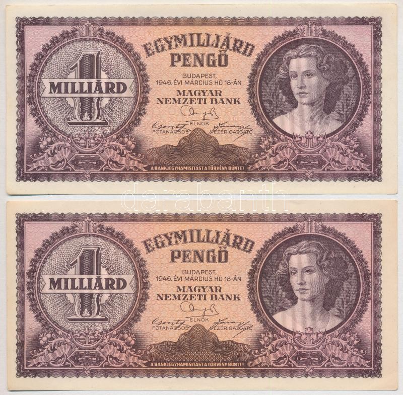 1946. 1.000.000.000P (2x) sorszámkövetők T:I- https://www.darabanth.com/de/347-Fernauktion/347.0/Numismatik/Ungarische-Banknoten~1000006/1946-1000000000P-2x-sorszamkovetok-TI-~II1968283
