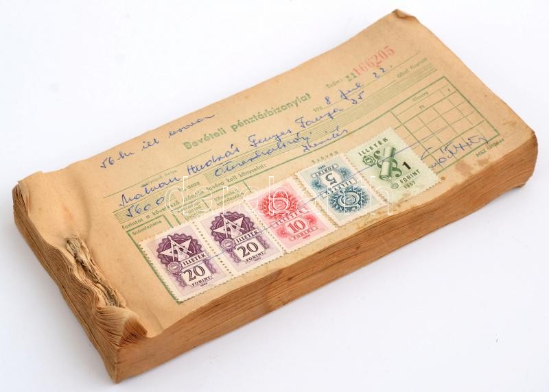 Beschreibung: 1968-1969 Bevételi pénztárbizonylat tömb, számos modern okmánybélyeggel.