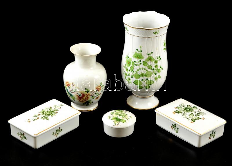 Beschreibung: Hollóházi Erika mintás tárgyak, matricás, jelzett, apró kopás nyomokkal, összesen: 5 db