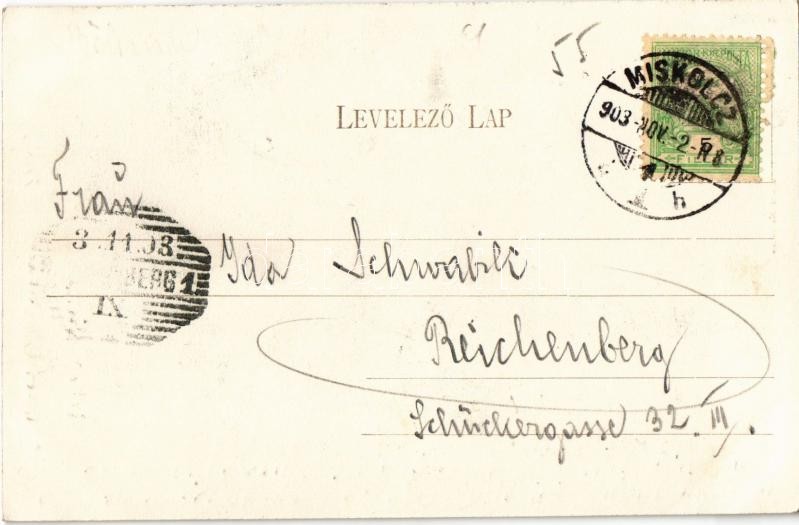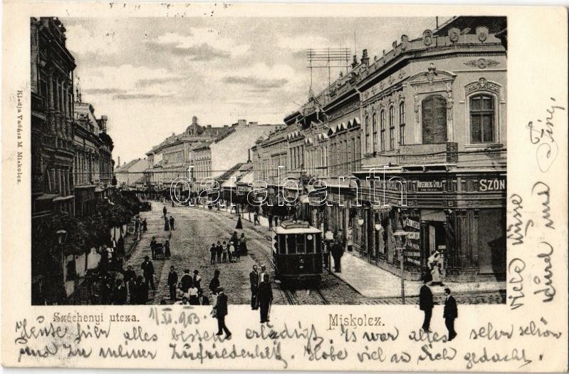 Beschreibung: 1903 Miskolc, Széchenyi utca, villamos, Rosenberg Gyula üzlete, Takarékpénztár, Lloyd szálloda. Kiadja Vadász M.