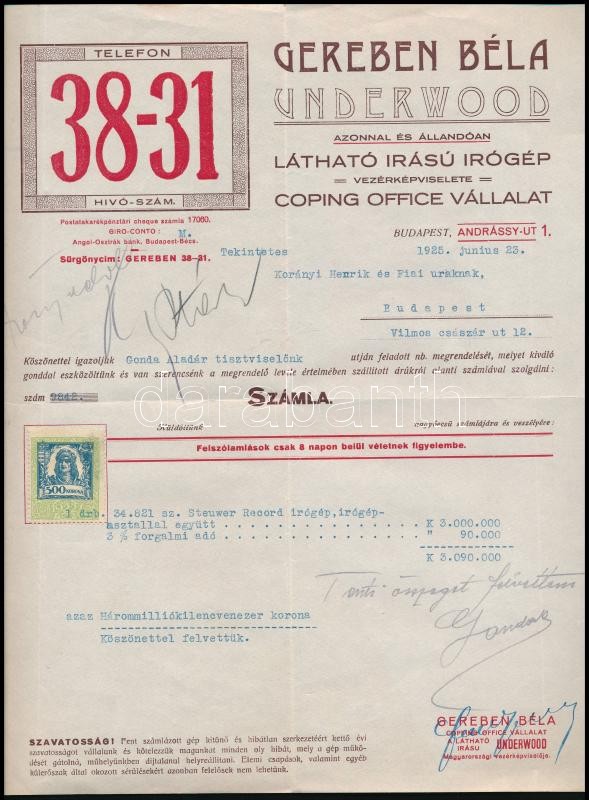Beschreibung: 1925 Bp., Gereben Béla Underwood látható írású írógép fejléces számla 500 korona okmánybélyeggel