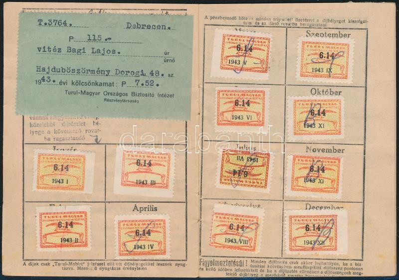 1943 Turul Magyar Országos Biztosító Intézet díjbefizetési könyvecske,... https://www.darabanth.com/de/348-Fernauktion/348.0/Kunst-Dokumente-andere-Sammelgebiete/Dokument~500017/1943-Turul-Magyar-Orszagos-Biztosito-Intezet-dijbefizetesi-konyvecske-35-db-belyeggel~II1978013