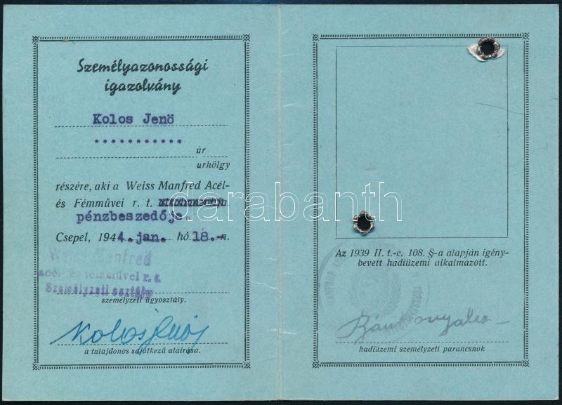 1944 Csepel, Weiss Manfred Acél és Fémművei Rt. pénzbeszedőjének szemé... https://www.darabanth.com/de/348-Fernauktion/348.0/Kunst-Dokumente-andere-Sammelgebiete/Dokument~500017/1944-Csepel-Weiss-Manfred-Acel-es-Femmuvei-Rt-penzbeszedojenek-szemelyazonossagi-igazolvC3~II1976558