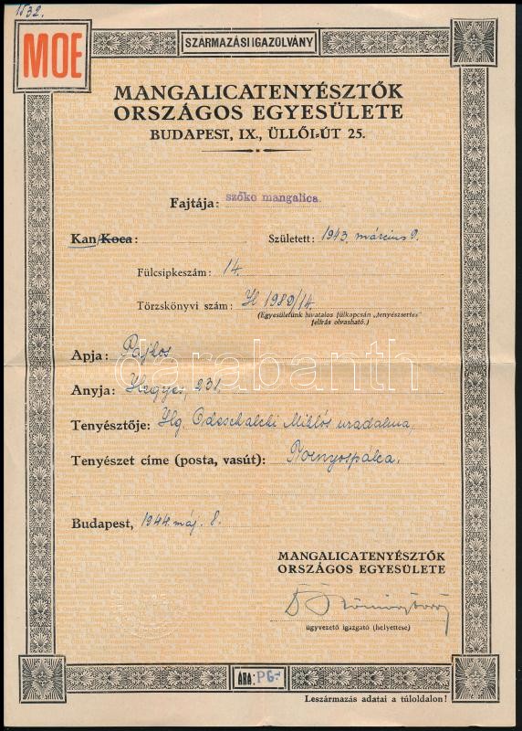 Beschreibung: 1944 Mangalicatenyésztők Országos Egyesületének származási igazolványa, hátoldalán táblázattal.