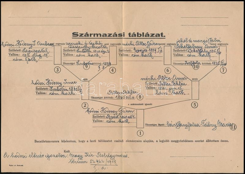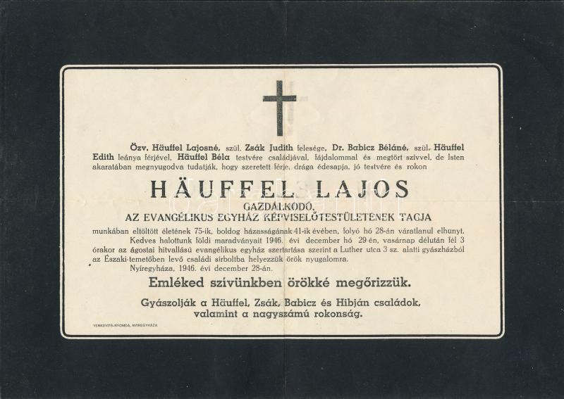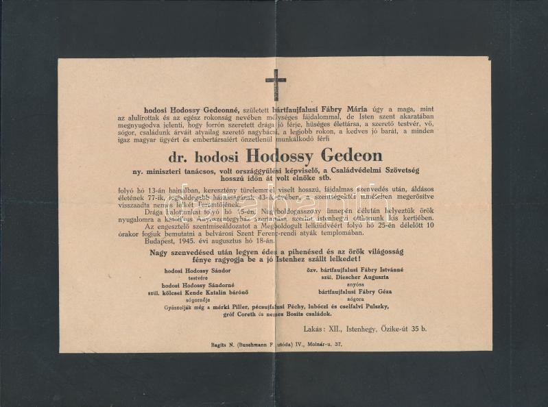 1945-1946 dr. hodosi Hodossy Gedeon ny. miniszteri tanácsos, országgyűlési képviselő, Családvédelmi Szövetség elnökének, és Häuffel Lajos evangelikus egyházi képviselő testületi tag halálozási értesítői, valamint Hodossy Gedeon származási igazolványa.