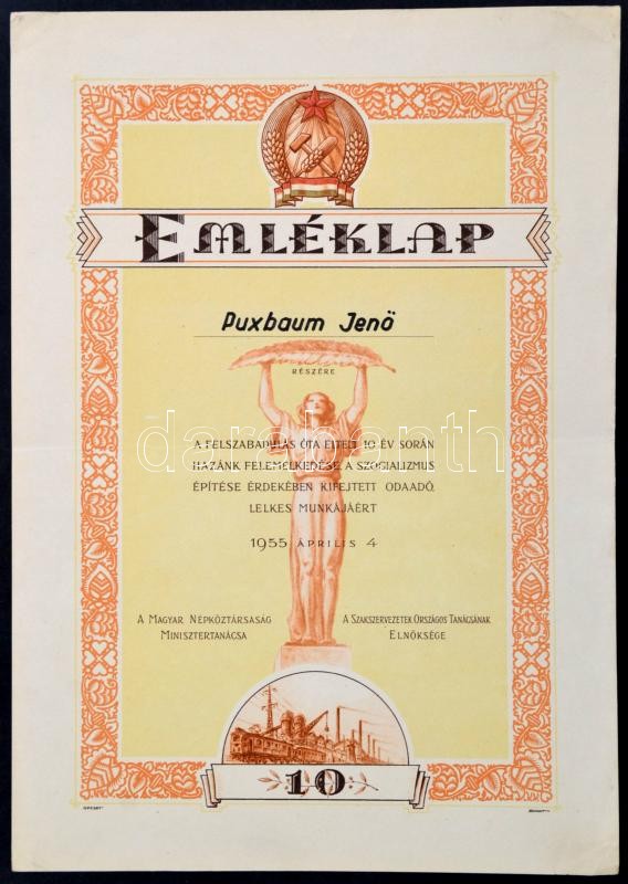 1955 Díszes szocreál emléklap a felszabadulás 10. évfordulójára https://www.darabanth.com/de/348-Fernauktion/348.0/Kunst-Dokumente-andere-Sammelgebiete/Dokument~500017/1955-Diszes-szocreal-emleklap-a-felszabadulas-10-evfordulojara~II1977765