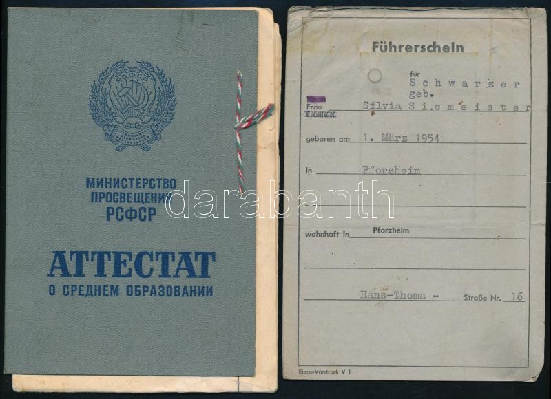 Beschreibung: 1969-1972 Szovjet középiskolai bizonyítvány a szófiai nagykövetségi iskola tanulója részére, hitelesített fordítással + fényképes német jogosítvány