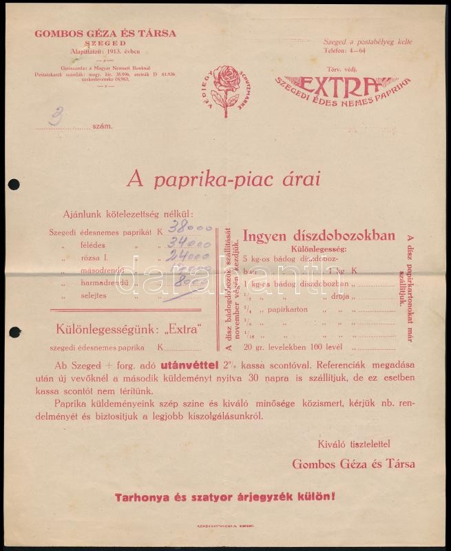 cca 1910-1920 Szeged, Gombos Géza és Társa paprika-piac árai, fejléces... https://www.darabanth.com/de/348-Fernauktion/348.0/Kunst-Dokumente-andere-Sammelgebiete/Drucksachen~500029/cca-1910-1920-Szeged-Gombos-Geza-es-Tarsa-paprika-piac-arai-fejleces-reklamnyomtatvany~II1976590