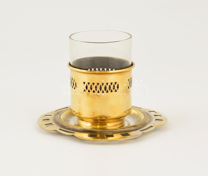 Beschreibung: Art deco fém pohártartó üvegbetéttel + kis tálka, jelzés nélkül, kopásokkal, különböző méretben