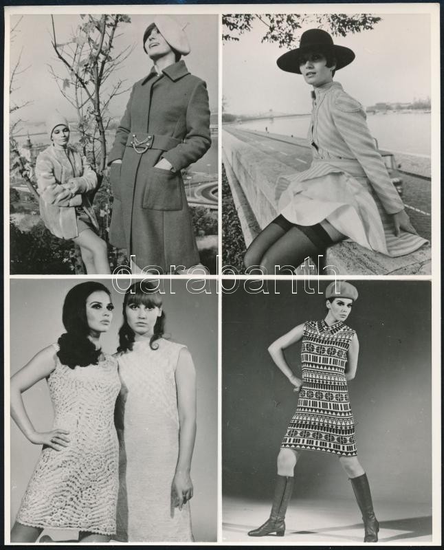 Beschreibung: Divattörténeti adalékok. A képeken feltüntetett időpontokban, Budapesten készült divatfotók, magyar tervezésű és gyártású ruhákról, 6 db vintage fotó, 23x18,5 cm és 25x18,5 cm között