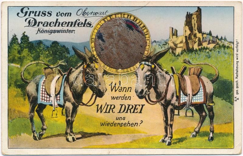 1938 Drachenfels, Königswinter; Wann werden wir drei uns wiedersehen? ... https://www.darabanth.com/de/349-Fernauktion/349.0/Ansichtskarten/Deutschland~2000032/1938-Drachenfels-Konigswinter-Wann-werden-wir-drei-uns-wiedersehen-humorous-postcard-with-donk~II1983598