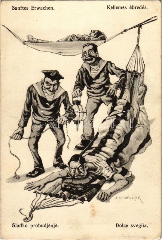 Sanftes Erwachten / Kellemes ébredés / Austro-Hungarian Navy K.u.K. Kriegsmarine humorous mariner art postcard. C.F. P. Nr. 22a 1917/18. s: Ed Dworak (EK)