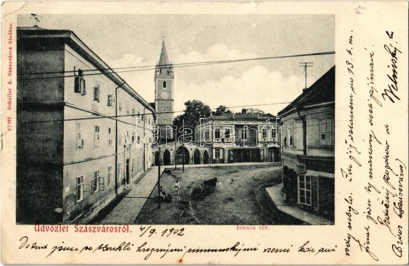 Beschreibung: 1902 Szászváros, Broos, Orastie; Iskola tér, Evangélikus templom, Gyógyszertár. Kiadja Schuller A. / School Square, Lutheran church, pharmacy (EK)
