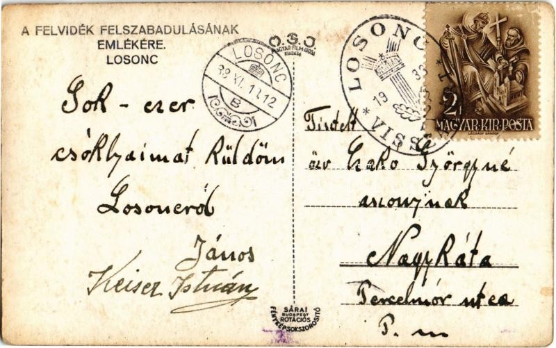 1938 Losonc, Lucenec; bevonulás, "Éljen Magyarország!", magyar zászlós és címeres kapu / entry of the Hungarian troops, decorated gate with Hungarian flags and coat of arms + "1938 Losonc visszatért" So. Stpl