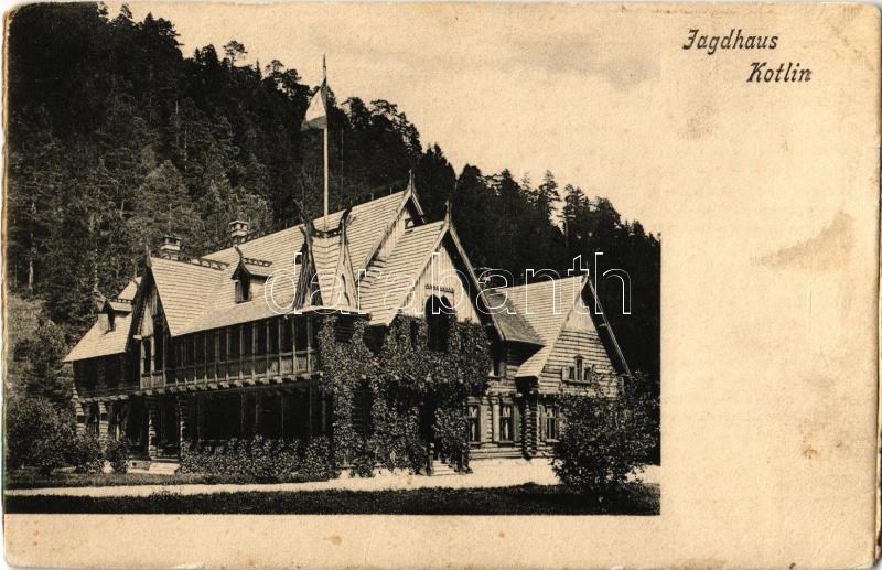 Beschreibung: Barlangliget, Höhlenhain, Tatranská Kotlina (Tátra, Magas Tátra, Vysoké Tatry); Jagdhaus Kotlin (Fürst Hohenlohe'sches Jagdschloss) / Hohenlohe herceg vadászkastélya, hátoldalon reklám / hunting lodge, hunting castle, advertisement on the backside (r)