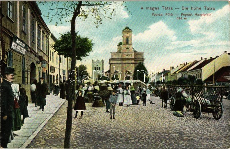 Poprád (Tátra, Tatry); Fő tér, templom, piac, étterem bor és sörcsarnok / Restauration Wein & Bier Schank / main square, church, market with vendors, restaurant and beer hall